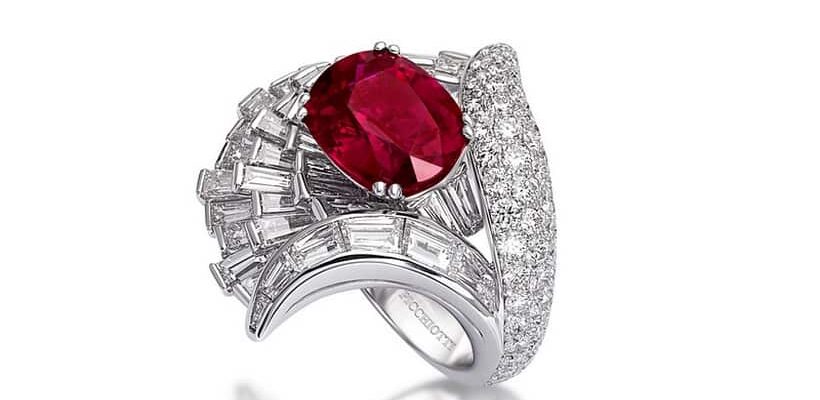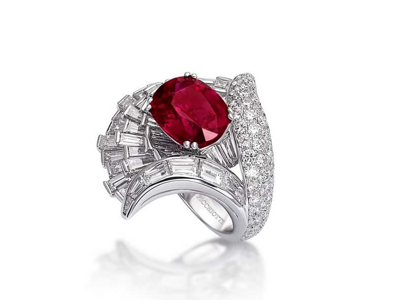 Но вернемся к кольцу, посвященному 50-летию Пиккиотти. Напоминающее амфитеатр, это драгоценное кольцо украшено потрясающим рубином в сердцевине, драгоценным камнем, который был классифицирован как полностью натуральный, без термической обработки или улучшения цвета, что делает это украшение абсолютной редкостью. Идеальный драгоценный камень искали повсюду, готовясь к празднованию мастерства и мастерства Picchiotti.