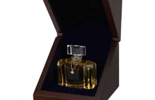Сама хрустальная бутылка представляет собой классический и чрезвычайно редкий предмет из 90-х годов, украшенный всего одним белым бриллиантом Fairtrade, установленным вручную лондонским экспертом по ювелирным изделиям. Кроме того, украшение из 18-каратного золота подвешено на хрупкой на вид цепочке, украшенной гравировкой Royal Arms на фирменном брелоке.