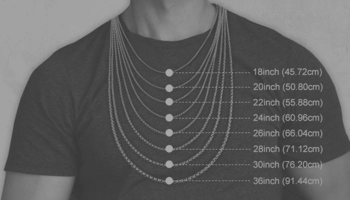 Выберите правильную длину — 18-дюймовые цепи предпочтительнее для шеек меньшего размера, а затем доходят до основания грифа; 20-дюймовые цепи достигают ключицы, 22-дюймовые цепи будут висеть на несколько дюймов ниже ключицы, 24-дюймовые цепи висят на несколько дюймов выше грудины, а 30-дюймовые цепи опираются на грудину.