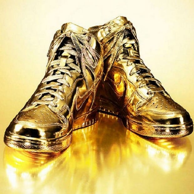 Эта ограниченная серия обуви, названная, как сообщается, кроссовками Nike Dunk High из 24-каратного золота, включает в себя эти потрясающие кроссовки Indulgences No. 5 — 28-сантиметровые туфли шириной 13 см и высотой 18 см — довольно роскошные, нам нравится думать о них. .