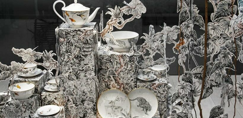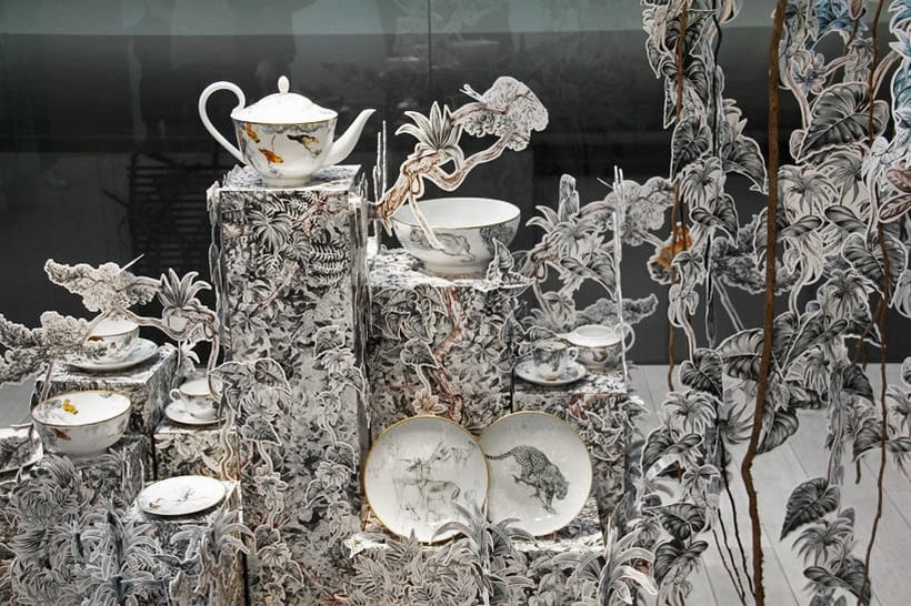 Эта изысканная коллекция, представленная в Studio Des Acacias в Париже, больше похожа на художественную инсталляцию: весь первый этаж студии превращается в амазонские джунгли примерно на пять часов. Потребовались драпирующиеся лозы, туман и экзотические растения, не говоря уже о пяти днях кропотливой работы по надлежащему раскрытию Фарфоровая коллекция Carnets d’Equateur.