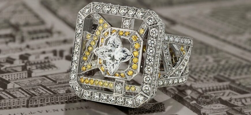 Место, где доступна коллекция, Вандомская площадь, представляет собой двухэтажный бутик с собственной мастерской, украшенной бриллиантовой огранкой в форме знаменитого цветочного логотипа Vuitton, стоимостью ошеломляющие 9 миллионов евро (около 11 миллионов долларов). -Кольцо Elysees стоимостью 92 000 долларов, инкрустированное бриллиантами и рубинами. Вышеупомянутое кольцо прекрасно изображает улицы Парижа и, в частности, Вандомскую площадь.