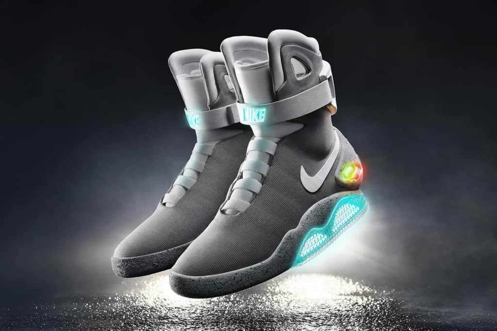 Это первая из когда-либо произведенных пар обуви, которая зашнуровывается сама, и к тому же они светятся. Они были созданы специально для фильма, в котором подросток Марти путешествует в 2015 год на машине времени ученых. Оригинальная пара, которую Майкл Дж. Фокс носил в 1989 году в сиквеле, была продана летом 2018 года за колоссальные 92 100 долларов, а выручка от продажи пошла в фонд болезни Паркинсона Майкла Дж. Фокса.