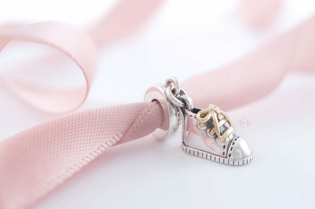 Помимо оксидированной строчки, Детская обувь болтается также имеет резиновые детали подошвы. Украшение в форме сердца украшает заднюю часть обуви и выгравировано с логотипом Pandora. Конечно же, изюминкой этого шарма является шнурок из 14-каратного золота на обуви, перевязанный аккуратным бантом!