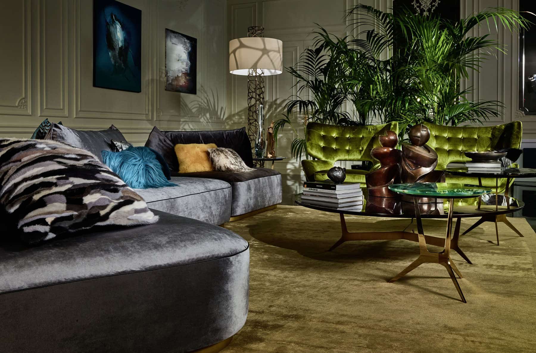 К этим диванам примыкает пара прекрасных кресел Devis с разноцветным мотивом пальмовых листьев из нового шелка с принтом Charlize. Также следует отметить два кресла Maclaine с их характерным стилем середины 20-го века и обивкой из пыльно-розового бархата.