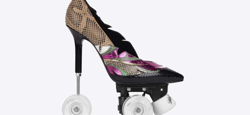 Нечетная пара туфель стоимостью 2600 долларов изготовлена из разных видов кожи и украшена броскими аппликациями, заклепками и кристаллами. Вы могли заметить, что помпа имеет одно колесо на конце и еще два на подошве, а также стопор спереди. Я не уверен, что эти туфли готовы к дискотеке, но они определенно выглядят круто.
