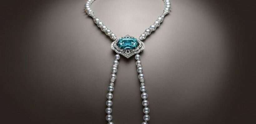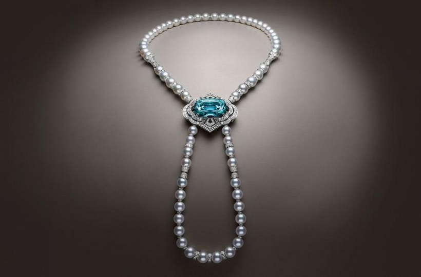 Louis Vuitton Conquêtes включает в себя три великолепных ожерелья, одно из которых украшено длинной цепочкой из жемчуга и бриллиантов, инкрустированной синим турмалином весом 54,3 карата, вызывающим слюни, а два других украшены мандариновым гранатом весом 16,82 карата и имперским топазом весом 37,07 карата соответственно.