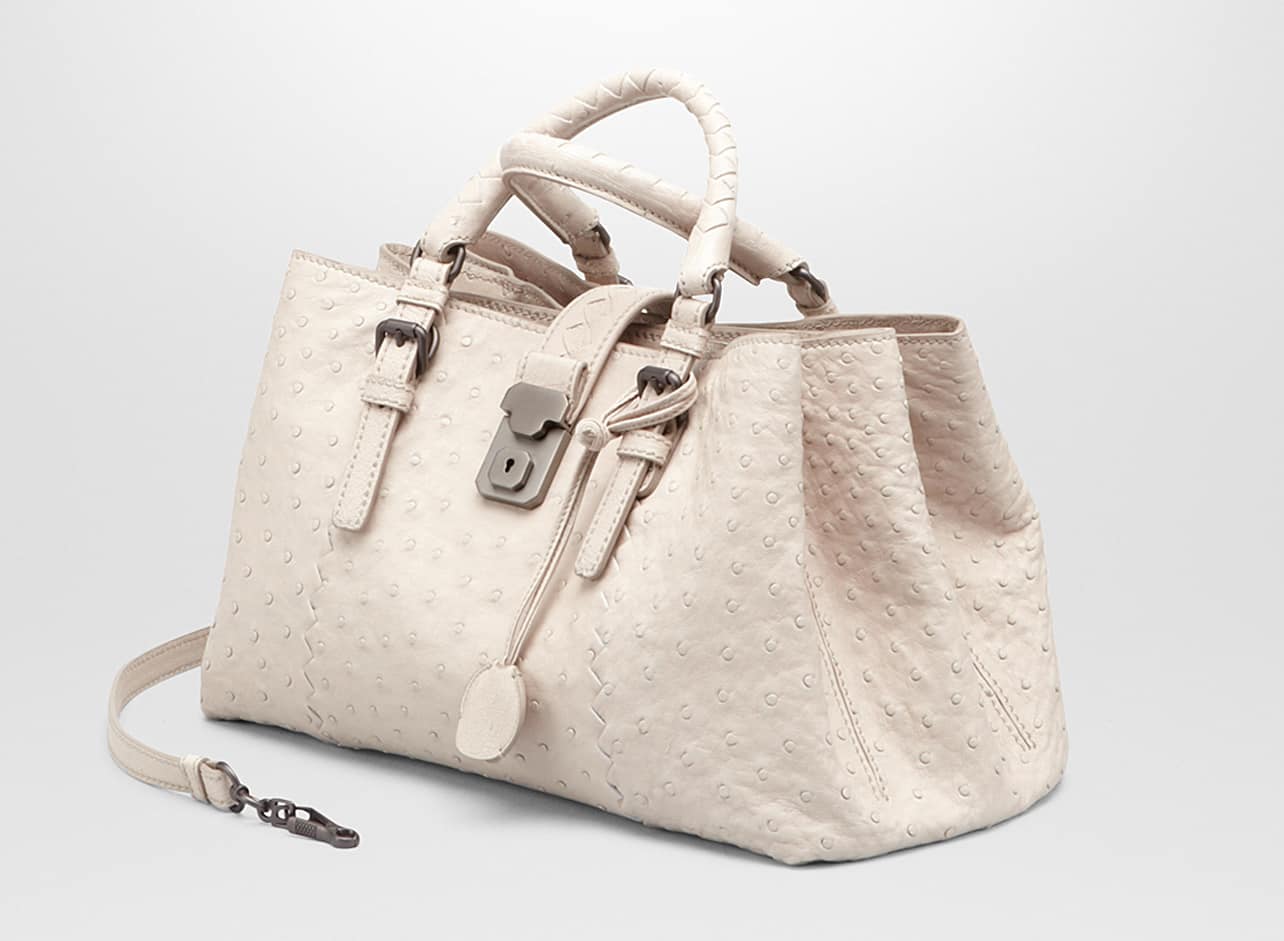 Вечная сумка Roma с отделкой под старину страусом и невероятным вниманием к деталям была отделана с использованием эксклюзивной техники зигзага. Итальянский роскошный дом также выбрал контрастный цветовой тон, привлекая внимание к элегантной конструкции сумки и высококачественной коже.