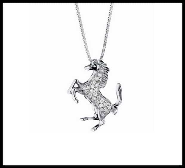 Знаменитый гарцующий конь, символизирующий Феррари в настоящее время можно просматривать на целом ряде вещей, от украшений до всевозможных аксессуаров. Благодаря сотрудничеству Ferrari с итальянским дизайнером Дамиани, родилась совершенно уникальная серия украшений. Состоящие из ожерелий, серег и подвесок, они могут похвастаться элегантностью и редкостью гарцующей лошади.